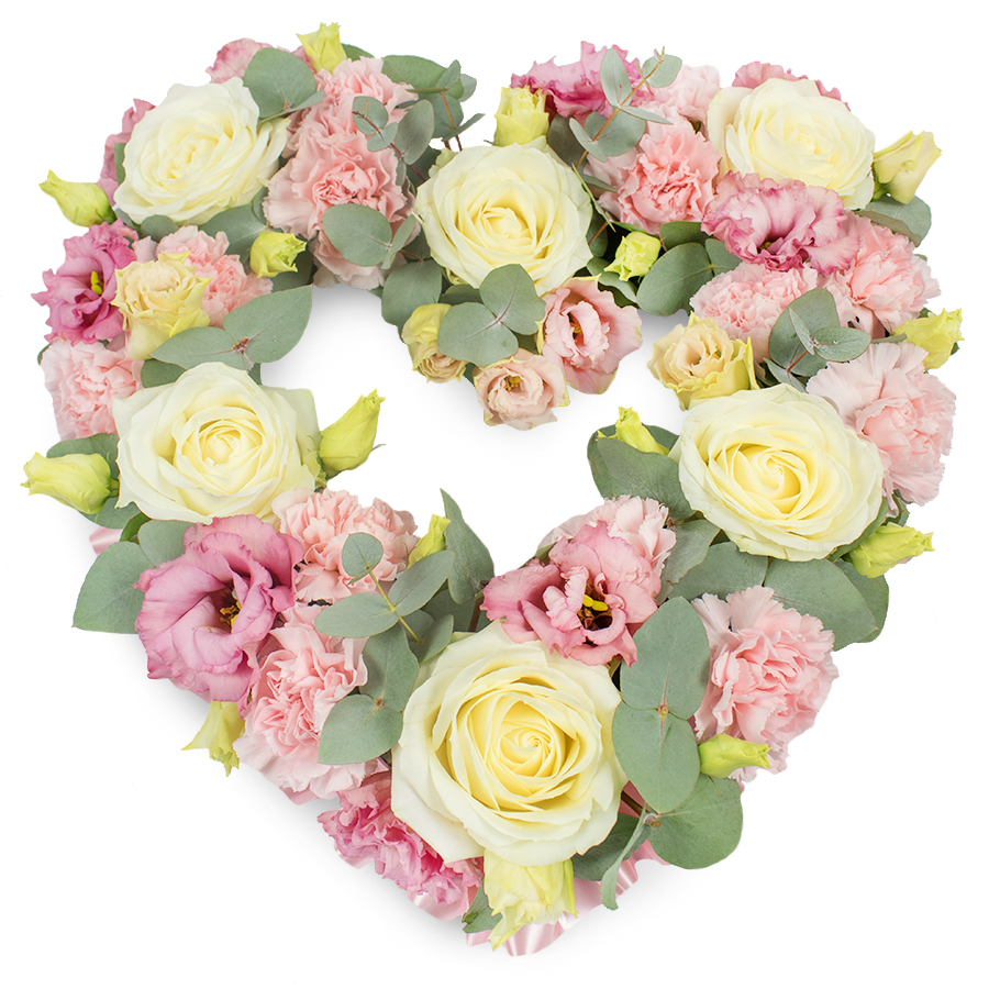 Express your deepest emotions with our Serene Heart Tribute Bouquet. This unique and stunning arrangement features pristine white roses, soft pink carnations, elegant pink lisianthus, and lush eucalyptus leaves, artfully combined to create a beautiful tribute.