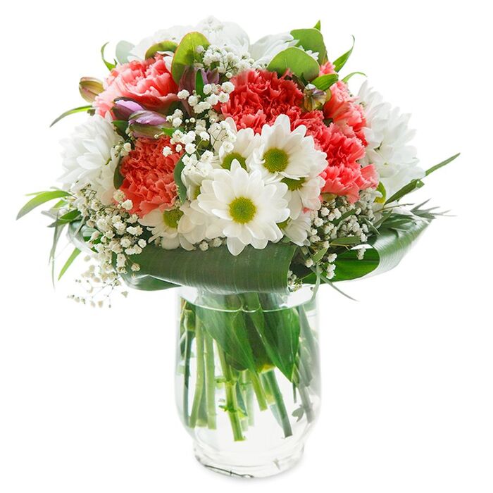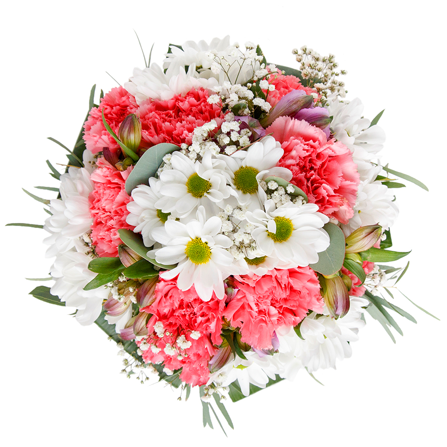 Embrace purity and softness with our white and pink flower bouquet, designed to bring elegance and charm to any setting. This beautiful arrangement includes snow-white chrysanthemums, delicate gypsophila, gentle light pink carnations, and vibrant aspidistra leaves, all expertly combined to create a stunning floral display.